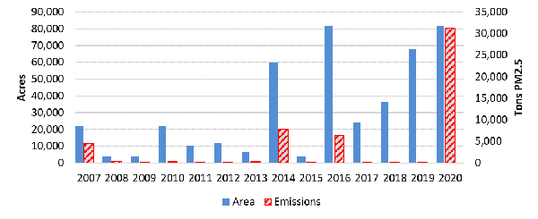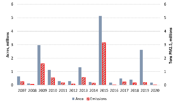 The figures below, represent the annual emissions from prescribed fires and wildfires from 2007 through 2019. A prescribed fire is a fire intentionally ignited by management actions in accordance with applicable laws, policies, and regulations to meet specific objectives; it is also sometimes called a “controlled burn” or “prescribed burn”. A wildfire is an unplanned, unwanted wildland fire including unauthorized human-caused fire.