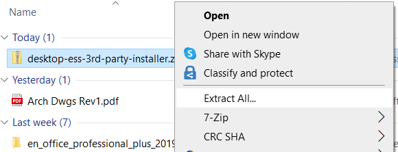 Locate the downloaded file called desktop-ess-3rd-party-installer.zip. Right-click on the file, and click on Extract All, then follow the prompts to extract the file.