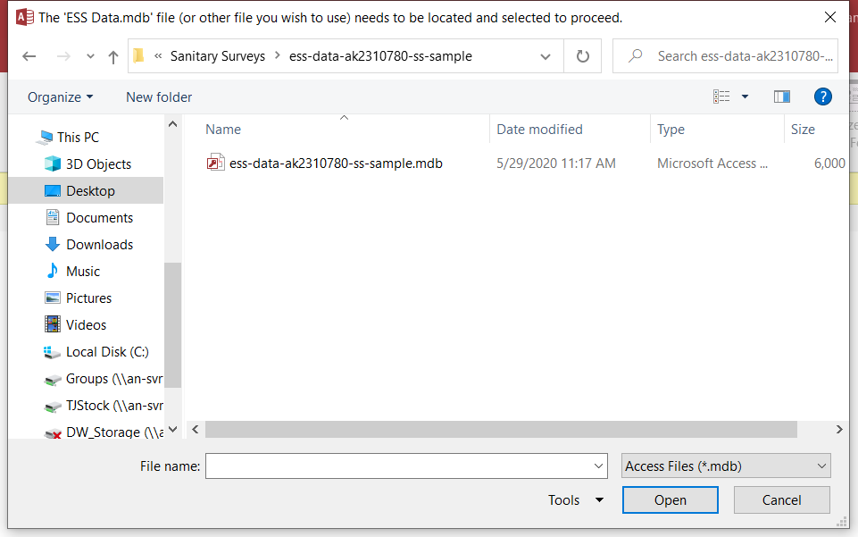 The Desktop Electronic Sanitary Survey application consists of a client file and a data file. The Client file, called Desktop ESS 2020 3rd Party, is a Microsoft Access program that provides the user interface for the application. The data file (ESS Data_AK2XXXXXX.mdb) is the sanitary survey file that contains all of the data tables used for the application and is a MS Access database.