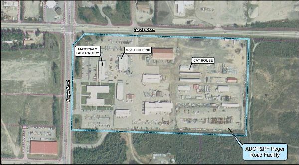 The ADOT&PF Peger Road complex includes the Maintenance and Operations building, Materials Laboratory, Technical Services, the Cat House (where Caterpillar tractors are stored), a seasonal laboratory, State equipment fleet/maintenance shop, a Bridge Shop building, equipment wash-down areas, and areas where other equipment has been stored.