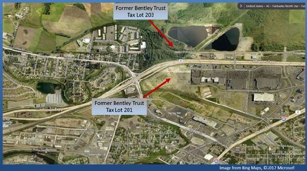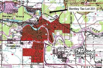 The general location of the areas of land called Bentley Trust Tax Lots 201 and 203 is north of the City of Fairbanks. The city is shown in red.