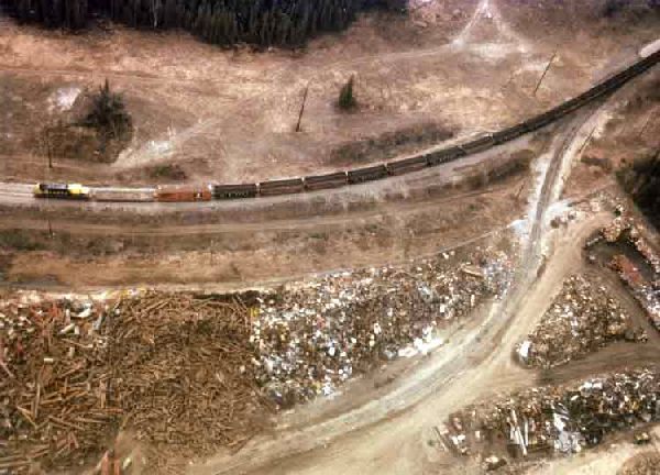 At the end of construction of the pipeline, scrap pipe, other metal and drums were stockpiled on Tax lot 201 for hauling south. Shown above the scrap piles is an Alaska Railroad train, The railroad tracks are at the southern boundary of the property. (DEC photo, late 1970s.)