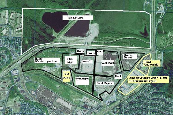 As contamination issues have been resolved, portions of Tax Lot 201 have been sold to a number of commercial establishments, such as Wal-Mart, seen beyond the intersection here. Other businesses are Home Depot, Fred Meyer, Lowe's, Chili's, a mall, several banks, (DEC photo, 2006)