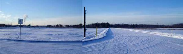 This panoramic composite photo shows the the empty Tax Lot 201,looking west and southwest. Groundwater has carried TCE contamination to this area, proposed for development. Restrictions on the use of groundwater will prevent users of any development from exposure to this contamination. The area will have city water available. (DEC photo 2006.)