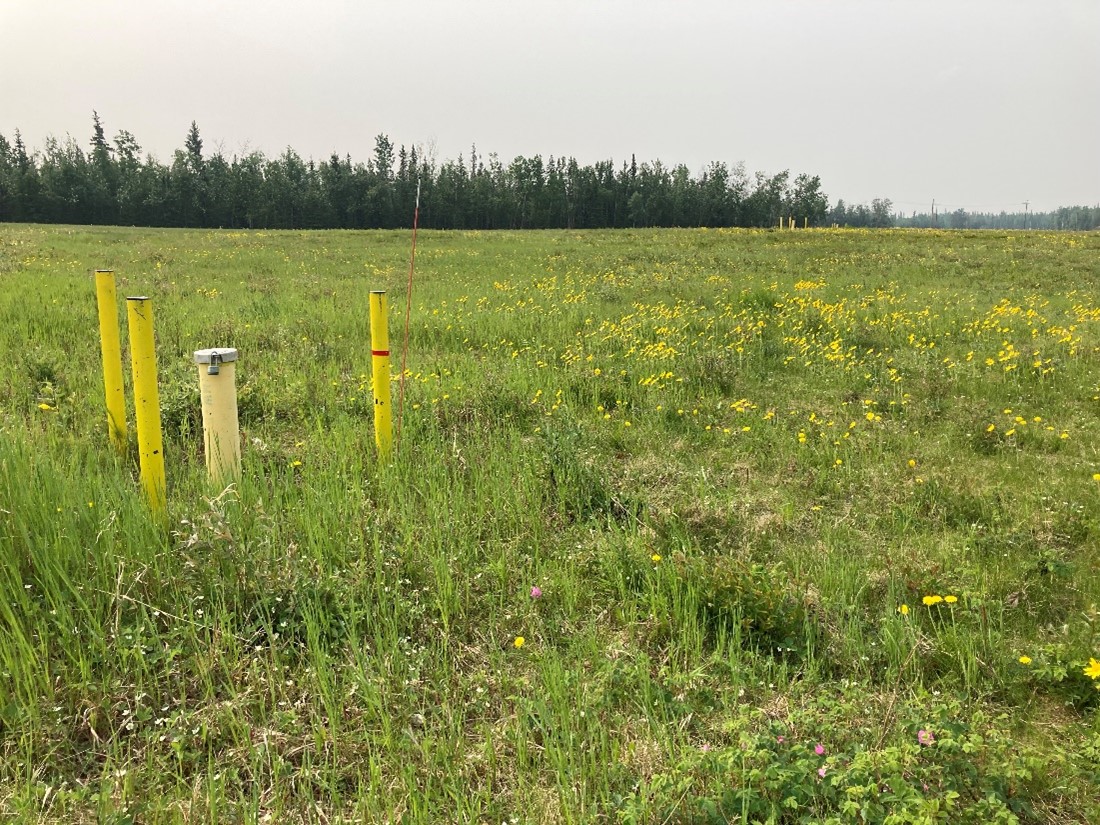 View facing south of monitoring wells with bollards around them for protection. [Photo by Erica Blake (DEC) in June 2022