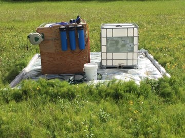 During long-term monitoring activities on Fort Greely, purgewater from groundwater sampling activities is generated. Due to the purgewater potentially containing contaminants of concern, the water is run through a granular activated carbon (GAC) system prior to discharging back to the site. [Photo by Leopold Palmer (USAG Fort Greely) June 2021]