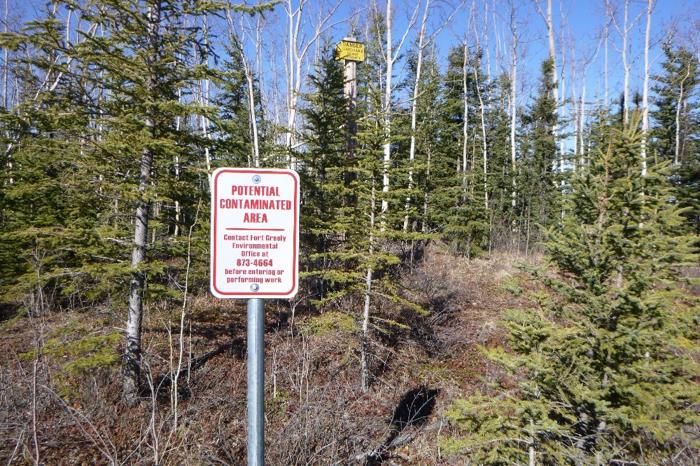 Photo shows a sign warning Fort Greely personnel about potential contamination. [Photo by Erica Blake (Alaska Department of Environmental Conservation), April 2019]