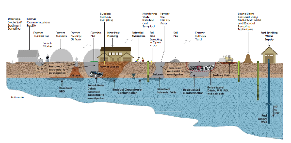 - Groundwater: Groundwater at the FCS is contaminated with POL and VOCs. Presumed source areas for this groundwater contamination have been removed to the greatest extent practicable. This material was removed during pre-RI construction activities, as IDW during the RI, and during two time-critical removal actions (TCRA) (one pre-RI and one post-RI). Groundwater monitoring at this site began in 2005, continued through the RI, and continues as a biannual monitored natural attenuation (MNA) sampling program. Historical or current exceedances define five groundwater plumes: the trichloroethylene (TCE) plume, the trichloropropane (TCP) plume, the main DRO plume, the MW62 DRO plume, and the MW77 DRO plume. Groundwater monitoring of the plumes at the FCS is ongoing.