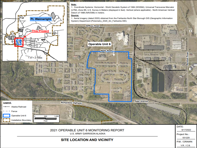 Taku Gardens (also known as the Former Communications Site and the Tanana Trails Family Housing Development) covers 54-acres, within the main cantonment of Fort Wainwright. The Former Communications Site (FCS) became the sixth operable unit (OU6) in 2007. The Record of Decision (ROD) for the site was finalized and signed January 2014 (See ‘More Information’ section to access a copy of the ROD). The FCS includes 110 housing units in 55 buildings that are intended for use as family housing for Fort Wainwright military personnel and their families.