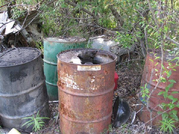Debris piles containing construction debris, car parts, batteries, tires, drums, and miscellaneous refuse.