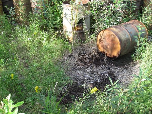 Drums, batteries, and contaminated materials temporarily stored in containment area set up by DEC’s contractors.