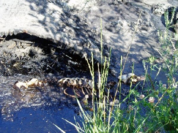 Additionally, two rail cars filled with asphalt tar exist on the property, one on the surface and one buried. In 2005, a cat and dog skeleton were observed in the asphalt tar leaking from the buried railcars. A neighbor stated that several animals have become trapped in the asphalt tar over the years. Currently the majority of the tar is buried, however the slow release is ongoing and may still present a hazard.