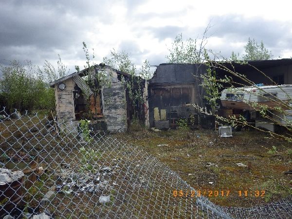 Shop building and burned shack; the downed fence is likely where transients were accessing the site.
