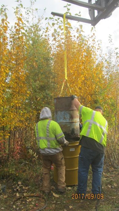 In September 2017, the National Response Corporation (NRC) was contracted by DEC to begin cleanup of the Miller property. During cleanup, NRC identified actively leaking drums and drums at risk of imminent release (i.e. open top, dented, flaking, corrosion, damaged, or bulging). Field tests have indicated that the contents of the drums include chlorinated solvents, other types of hazardous solvents, polychlorinated biphenyls (PCBs), grease, and oil. One of the open-top drums contained a deceased bird.