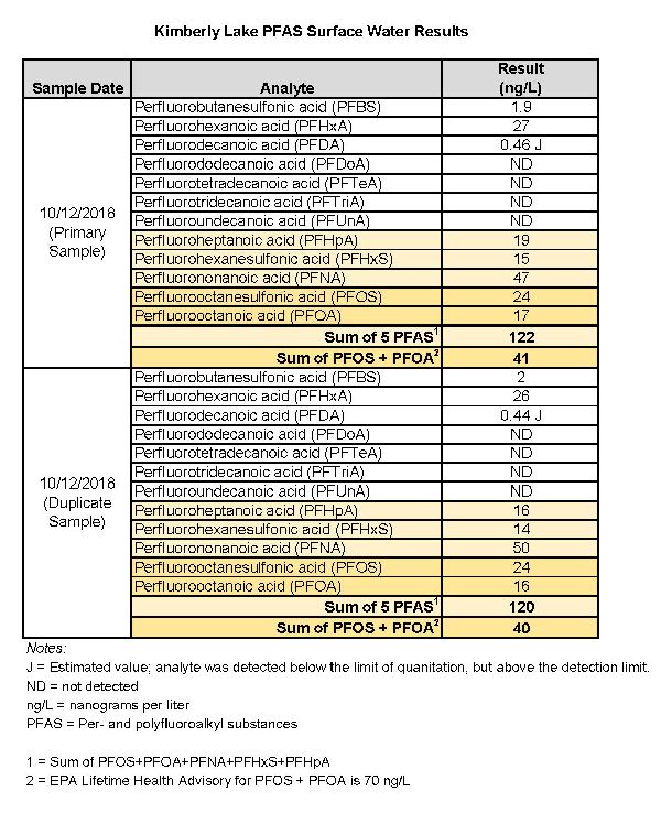 - Kimberly Lake PFAS surface water results. For a full laboratory report of sample results, contact DEC at 907-451-2117.