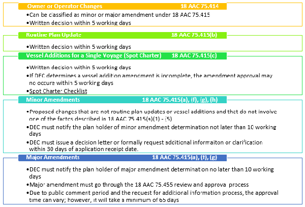 - A plan holder must apply for a plan amendment any time changes need to be made to a plan, regardless of how minor the changes may be. It is up to the plan holder to ensure that the plan continuously complies with state regulatory requirements and the plan holder can meet plan commitments. Amendments can include adding new regions of operation and updating notification lists to amending response capabilities as primary response action contractors revise their own response capabilities. To make an amendment, the plan holder must submit an amendment application package. Once DEC receives the amendment application package, the package will be evaluated to determine if the amendment is a routine update, or minor or major amendment. If it is a routine update or minor amendment, DEC can approve it without a public comment period. If it is a major amendment the review procedures under 18 AAC 75.455, which contains a public review period, are followed. For more information on plan amendments, please see 18 AAC 75.415; and Apply for a Contingency Plan.
