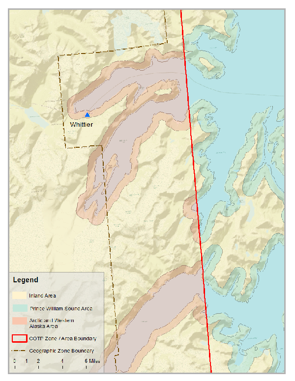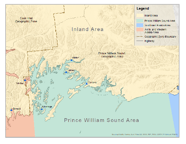 *Only the area surrounding the town of Whittier lies within the Arctic & Western Alaska Area, most of the Prince William Sound geographic zone lies within the Prince William Sound and Inland Areas. The following maps provide a visual representation of the boundary between these two Areas: