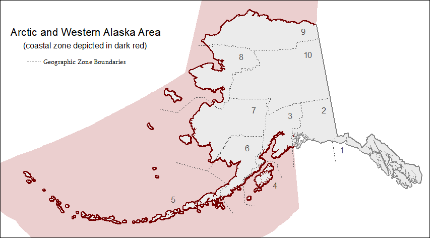 The Arctic and Western Alaska Area mimics the Captain of the Port Zone and extends seaward from the coastline 200 nautical miles to the Economic Exclusion Zone. The Area also extends inland 1,000 yards. The following geographic zones lie partially within the Arctic & Western Alaska Area: