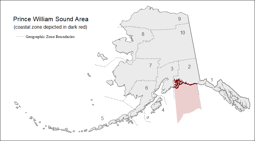 Note- The Western boundary of the Prince William Sound Area and Prince William Sound Geographic Zone are slightly offset (less than 20km). The following maps provide a visual representation of this offset: