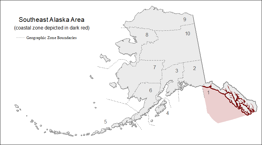 The Southeast Alaska Area mimics the Captain of the Port Zone and extends seaward from the coastline 200 nautical miles to the Economic Exclusion Zone. The Area also extends inland 1,000 yards. The following geographic zones lie partially within the Southeast Alaska Area: