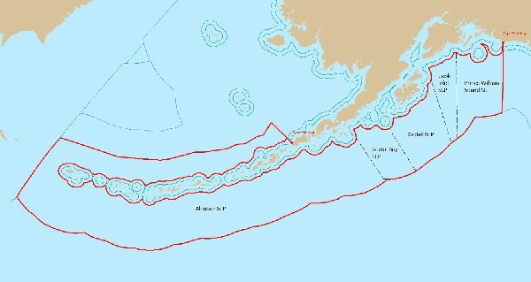 Figure 1. The preauthorization area (shown in red) begins 24 miles offshore and extends southward to the Exclusive Economic Zone, located 200 miles offshore, and 100 miles north of the Aleutian Chain. Two anchor points, located at Cape Suckling and Cape Sarichef, ensure all vessels entering Southcentral Alaska from the south, and traffic using the Great Circle route through Unimak Pass are subject to these dispersant preauthorization requirements.