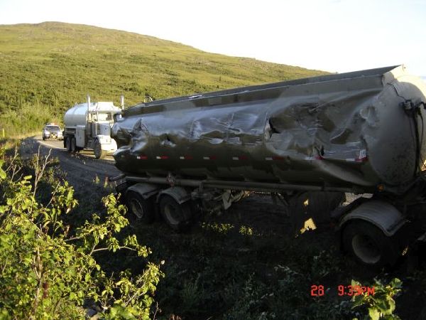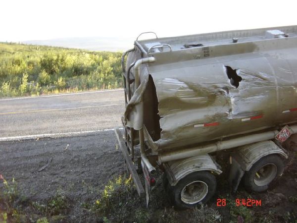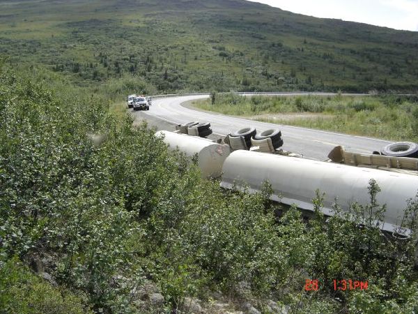 - A tanker truck pulling a pup (second tanker) went off the road and ruptured one of the fuel tanks.
