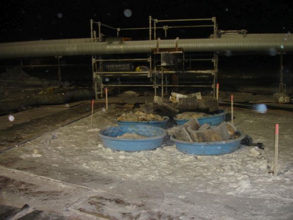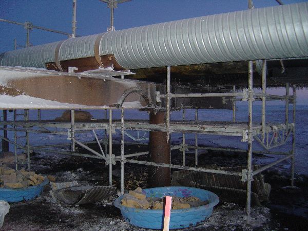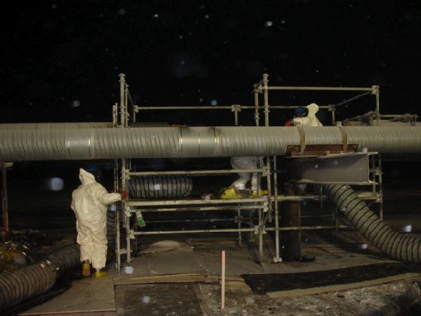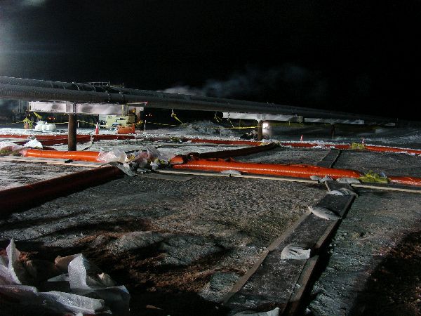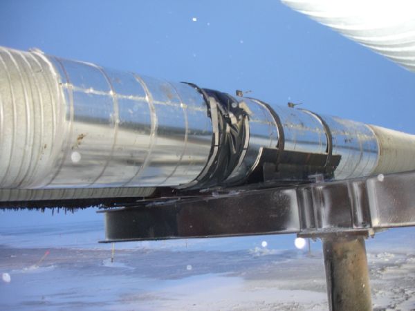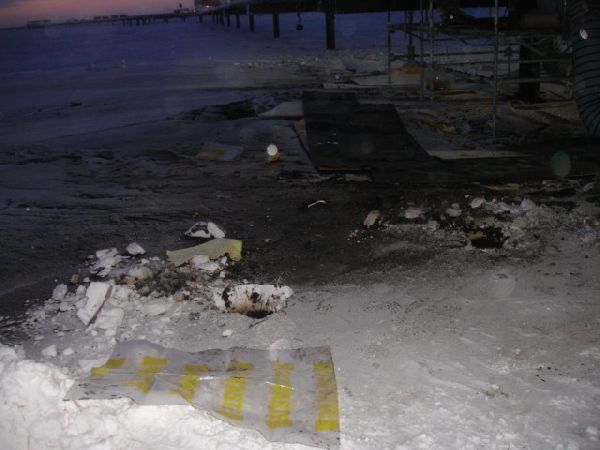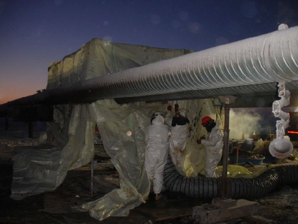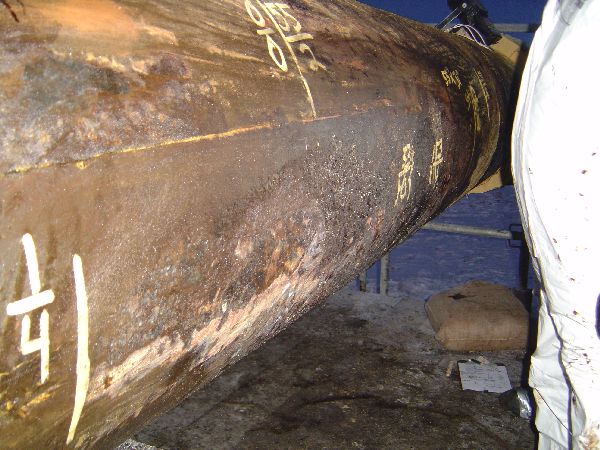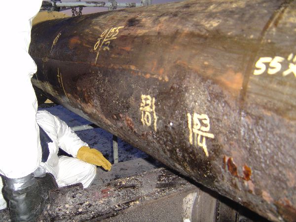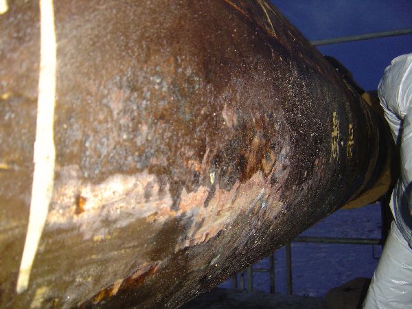 - CPAI reported external corrosion to the flow line. After the insulation from the flow line was removed, responders observed a 6-inch long crack (about 1/8 inch wide at the center) in the flow line. Investigators believe the cause was from external corrosion due to water trapped between the pipe and the insulation.