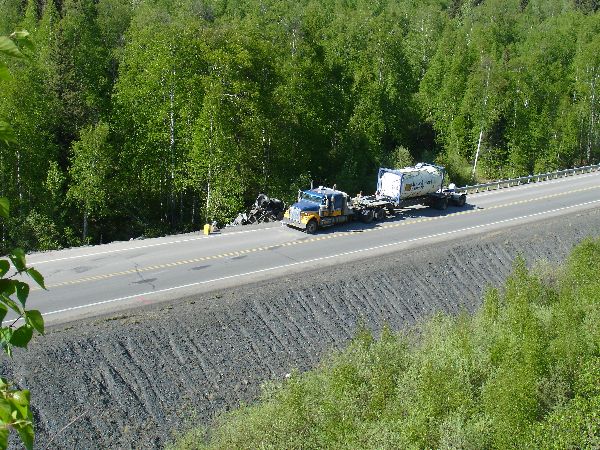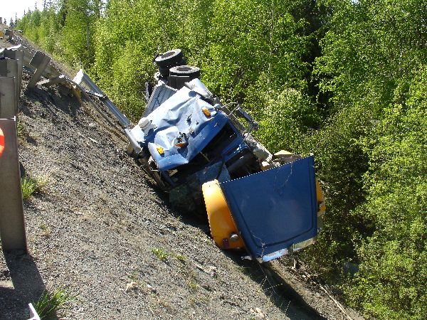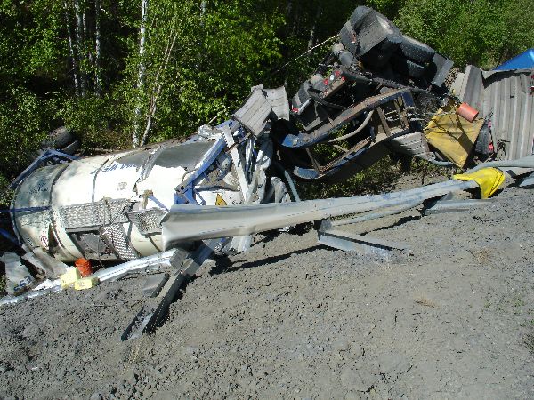 - An Alaska West Express tractor with an ISO-trailer containing 5,481 gallons of cleaning solvent lost control while descending on Elliot Highway slope at mile 45. Weather conditions were not a factor in the incident. The tractor and trailer careened off the highway, removed steel guardrails, and then landed on its side against a steep embankment near the final curve of the descent. There were two 150-gallon and two 80-gallon saddle tanks containing diesel on the tractor, of which only one 80-gallon tank released all of its content onto the embankment soil. Embankment soils are poorly graded gravel with cobbles, sand, and silt. Approximately one cubic yard of soil was removed after the wreckage was recovered. The driver was medivaced from the incident for medical attention.