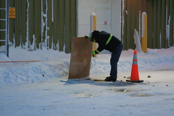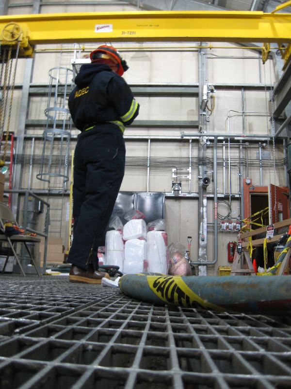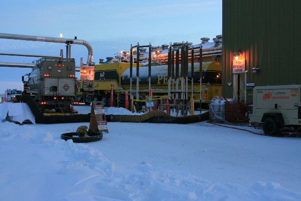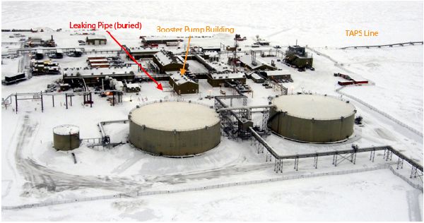 - Following the initial spill cleanup on January 8, responders constructed a temporary containment tank in the basement of the booster pump building to collect leaking oil at the seep site. With the temporary TAPS restart shortly after 9:00 PM on January 11 (see Sitrep #4), oil began flowing again through the suspect booster pump discharge piping. Flow from the seep has appeared to remain steady since the restart, with response crews recovering approximately 11, 214 gallons (267 barrels) of oil from the tank, which will be re-injected into the TAPS line at a later date.