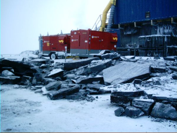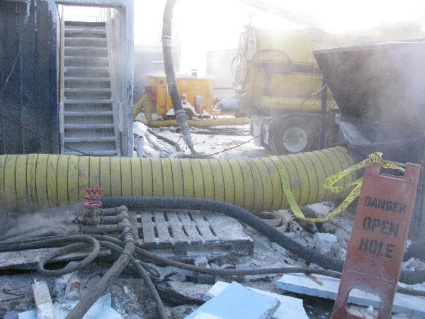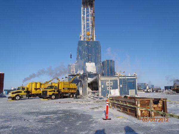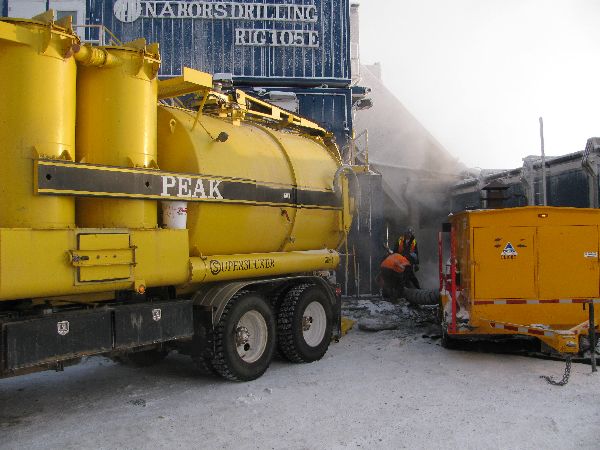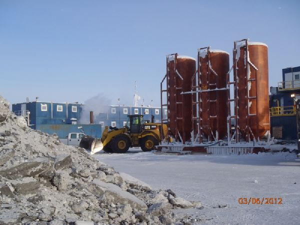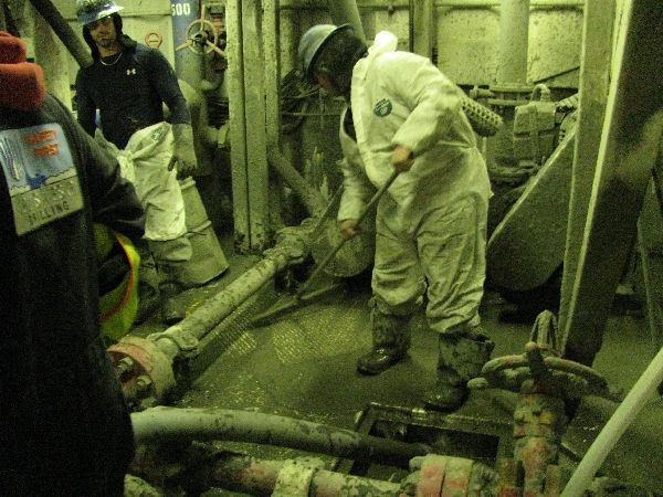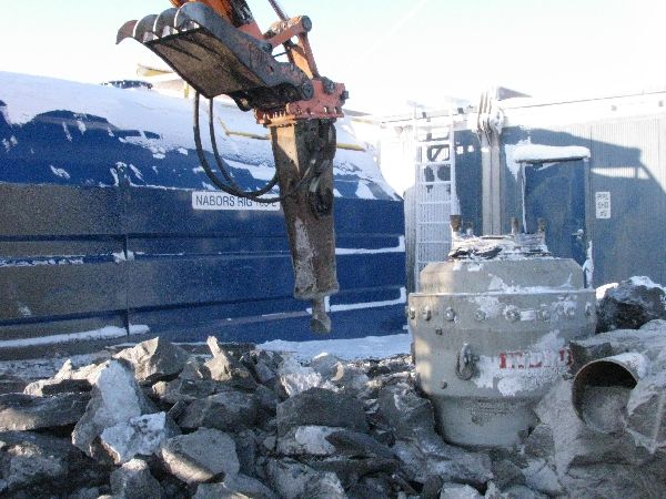 - Spill responders from Alaska Clean Seas (ACS), Penco and CCI used heavy equipment, such as loaders, excavators, trimmers, skid-steers, hydraulic hammers and snow machines with trailers, to remove the spill material from the heaviest contaminated zones. Hand tools were used to recover drilling mud from the areas of lightest contamination. Cleanup crews removed approximately 6,286 cubic yards of spilled material from the snow-covered tundra. In addition, 2,402 cubic yards of down-hole material and 116,928 gallons of water-based mud and freshwater from the steam units were recovered from the drilling pad during the initial response.