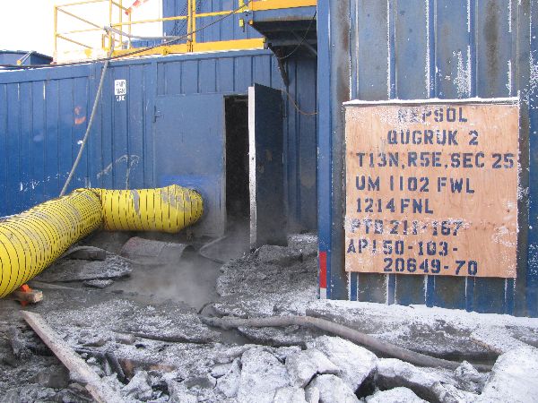 - Repsol contractor Nabors Drilling was drilling an exploratory well when the drill penetrated a shallow gas pocket at a depth of 2,523 feet, resulting in a gas kick. The gas kick drove drilling mud out of the well and through the gas diverter onto the ice pad and adjacent snow-covered tundra. The gas diverter is a pipe that extends approximately 75 feet from the drilling rig toward the south edge of the pad. Additional mud was pumped into the well in an attempt to control it, but that mud was also forced out by the gas.