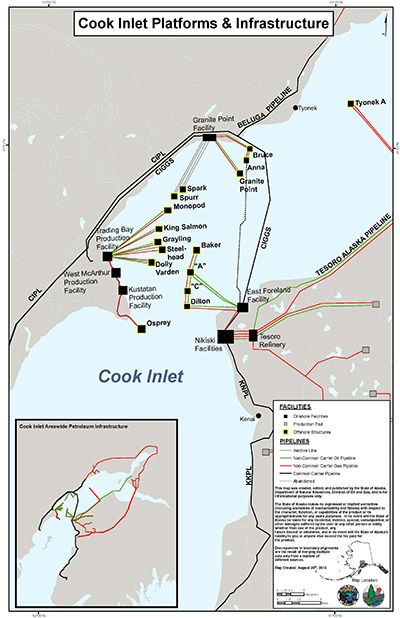 - Baker Platform, located offshore in Cook Inlet approximately 18 miles northwest of the City of Kenai and approximately 45 miles southwest of Anchorage (Latitude: 60.82917; Longitude -151.33361). See Cook Inlet Platforms & Infractructure map, courtesy of Cook Inlet Regional Citizens Advisory Council website. Additional information on their website at http://www.circac.org/library/