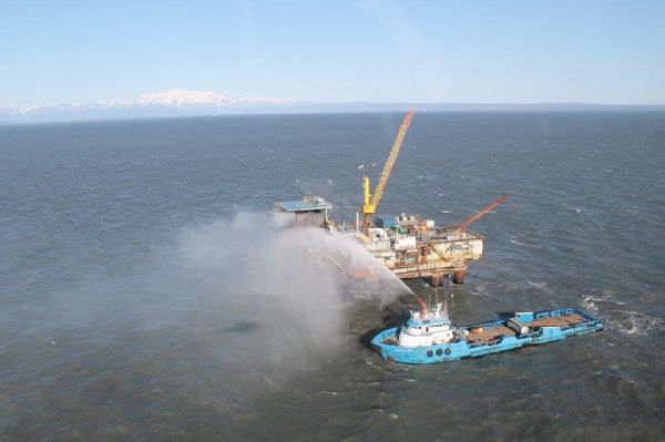 Overflight footage of the natural gas drill platform Baker in Cook Inlet near Kenai, Alaska, filmed by a Coast Guard C-130 Hercules airplane crew from Air Station Kodiak, Oct. 3, 2014. Multiple Coast Guard assets, along with personnel from Hilcorp, Alaska Department of Environmental Conservation, Nikiski Fire Department, CISPRI and Offshore Marine Services responded to the fire on the platform which began Oct. 2. U.S. Coast Guard video.