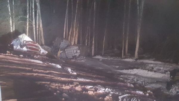 - At 12:00 pm, January 8, 2016, a southbound Lynden Transport tractor trailer hauling a chemical load left the roadway and tipped over onto its side. The trailer has split and there was a white vapor cloud emanating from the trailer.
