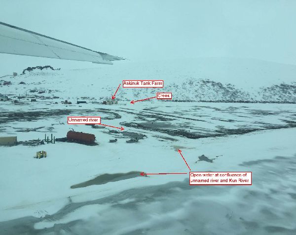 - The Askinuk Corporation estimates that the spill volume is 7,000 gallons of unleaded gasoline. The spill was contained in secondary containment. Around April 17th the tank farm operator pumped water out of secondary containment into the Kun River. It is unknown if that water contained spilled product, however the operator reported seeing sheen outside of the dike of the secondary containment.
