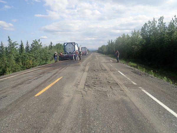 - A fuel tanker truck hauling a main tank and secondary pup tank was heading north on the Richardson Highway when it lost control and the secondary tank overturned. The secondary tank was damaged resulting in release of the entire contents of the tank.