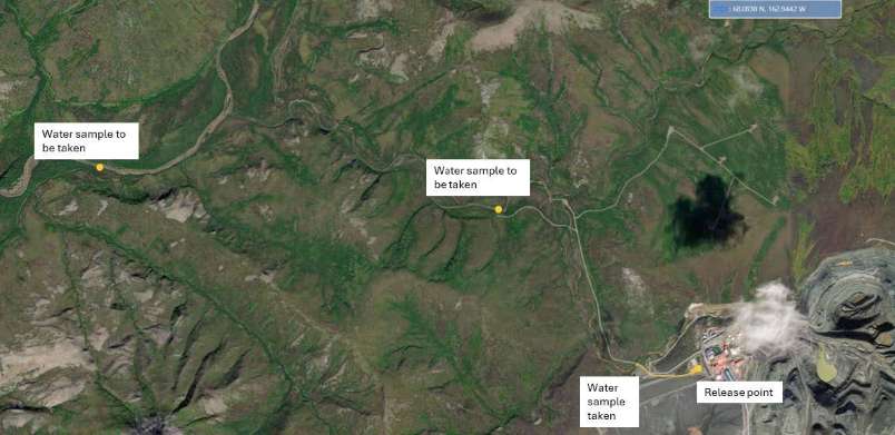 - An initial estimated amount of up to 400,000 gallons of process water was released. A portion of that left secondary containment. Of that, an estimated 100-1000 gallons left the gravel infrastructure to impact tundra and Red Dog Creek, which is currently not frozen. Process water has the potential to contain zinc, lead, cadmium, and tailing sediments.