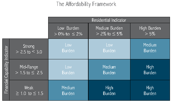 Affordability is determined by finding the intersection of the RI and FCI on the matrix (see picture on the right). The result is a determination that current rates are either a high, medium or low financial burden for the community of interest.