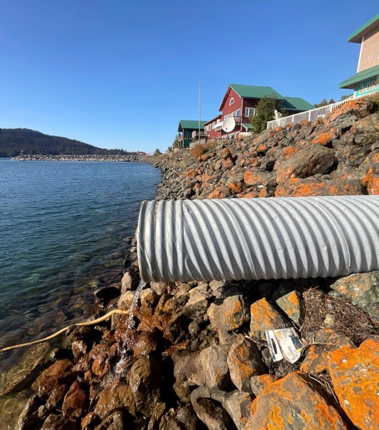 Stormwater flows out of an outflow pipe into Seldovia Bay. Photo by City of Seldovia.
