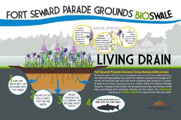 Bioswale educational sign designed by Haines Middle and High School students. The new sign is installed at the Fort Seward Parade Grounds in Haines, AK.