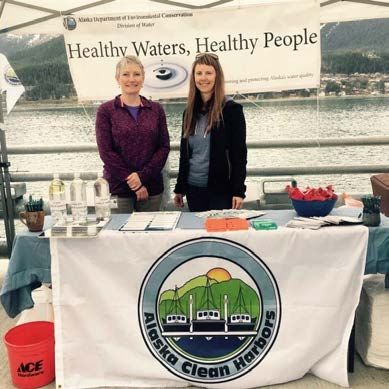 Alaska Clean Harbors outreach booth encouraging the use of marina sewage pump-out stations. Pictured are NPS program staff Gretchen Augat and Chandra McGee.