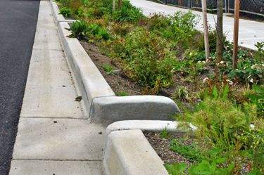 Green infrastructure example with a curb cut-out leading to a stormwater treatment bioswale adjacent to a roadway. The bioswale slows down and cleans the polluted stormwater. This protects the nearby stream and fish habitat.