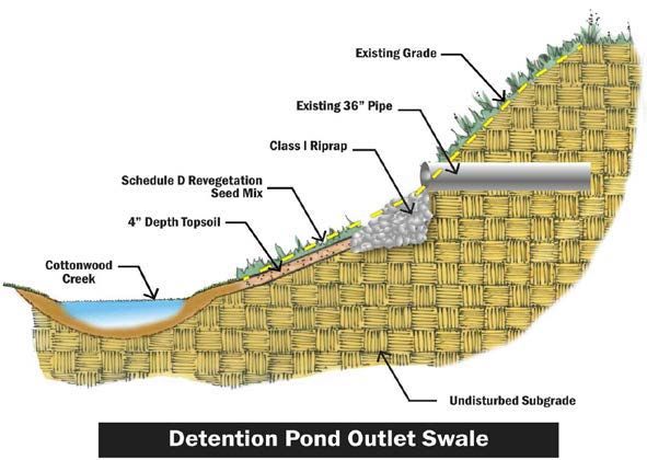 Example of a stormwater retrofit conceptual design to improve Cottonwood Creek’s water quality. Currently the stormwater is discharging from a detention basin and running down the steep slope carrying pollutants directly into the creek. The conceptual design slows the dirty stormwater discharge down, allows it to infiltrate into the rocks and get cleaned up by the vegetation before reaching the creek.