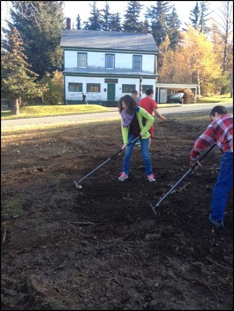 Volunteers help construct the bioswale at the Fort Seward Parade Grounds in Haines, AK. The bioswale is designed to capture and clean up polluted runoff water before it reaches nearby waterways.