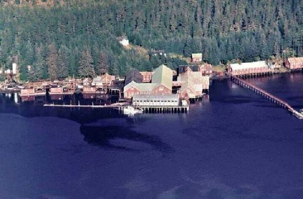 Cannery located in Hawk Inlet and associated industrial support facilities, prior to burning down in the 1970s.