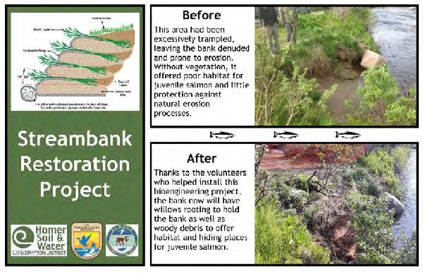 The Homer Soil and Water Conservation District (HSWCD), supported with funds from a DEC Alaska Clean Water Action (ACWA) grant, completed a restoration project at a popular Anchor River State Recreation Area. The riverbank near the Silverking campground had been trampled after many years of use. Trampled streambanks are more prone to erosion, which can cause water quality problems, and are less than ideal habitat for juvenile salmon. To restore the site, HSWCD carried out a site survey, consulted with residents of Anchor Point and partner organizations, and formulated a restoration plan. Community meetings and social media were used to keep the public up to date on restoration activities.