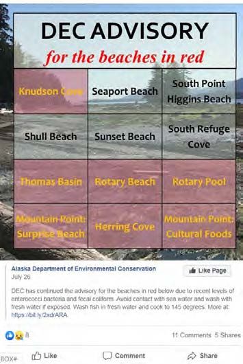 Example Facebook post from July 2019 highlighting beaches with recreational advisories.