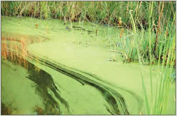 HABs often have variable appearance in the form of foam, scum, or mats on the surface of water - especially near shorelines. Dense blooms near the surface may resemble a layer of green paint or spilled milk. Blooms occur in the warmer months and can be more frequent in times of drought, and as the number of algal cells increase, the chances for toxins also increase. Nontoxic algae and floating plants can be distinguished from cyanobacteria blooms by color and texture. Green algae commonly encountered are typically are grass-green in color (see comparison images below). Many types of green algae consist of long, stringy filaments that feel either slippery or like cotton.