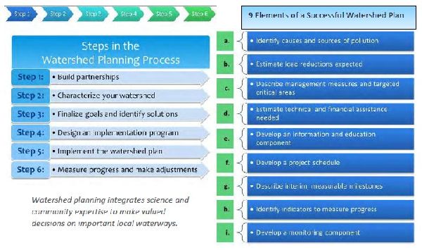 Watershed Management Plans are developed by working directly with tribal, local, and state governments and the community. There are six steps to watershed planning, and nine elements to a successful plan (see below). Feel free to contact DEC if you’d like more information on these watershed planning projects or would like to start your own watershed planning process.